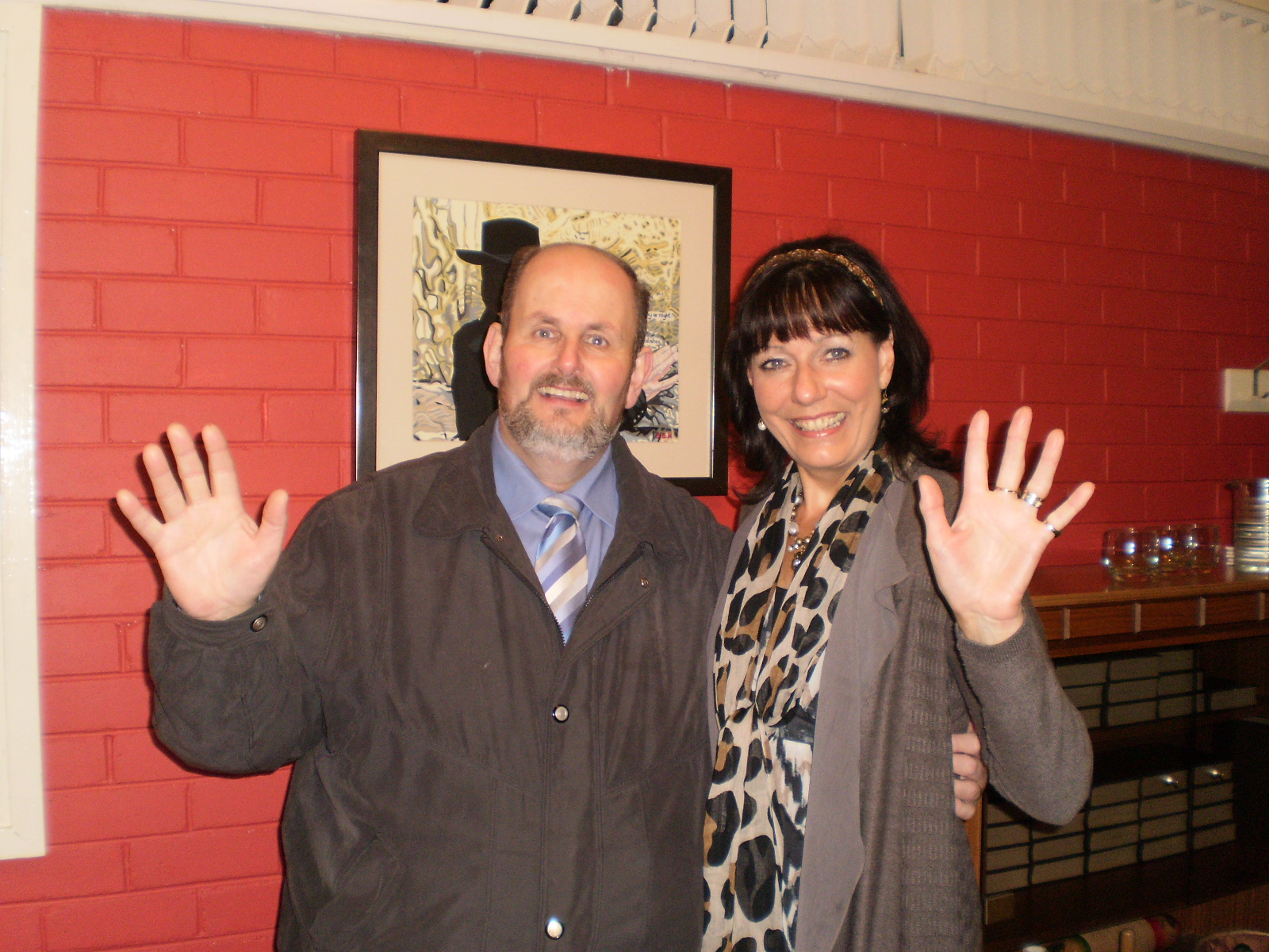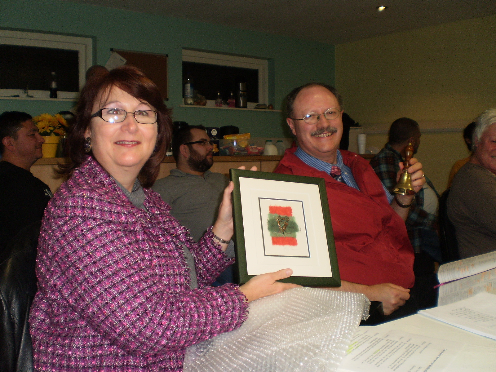 Pastors Steve and Tracy being given a Bell and a framed art piece