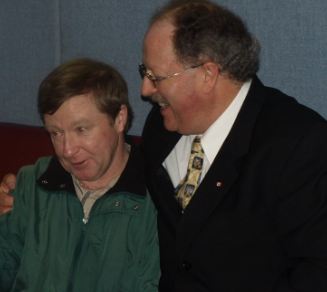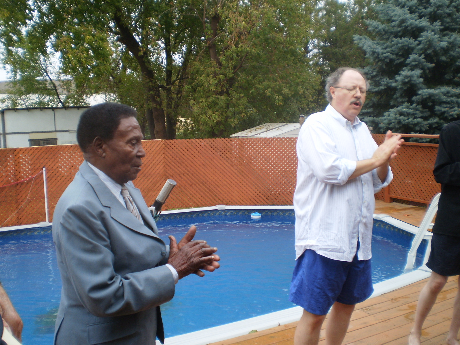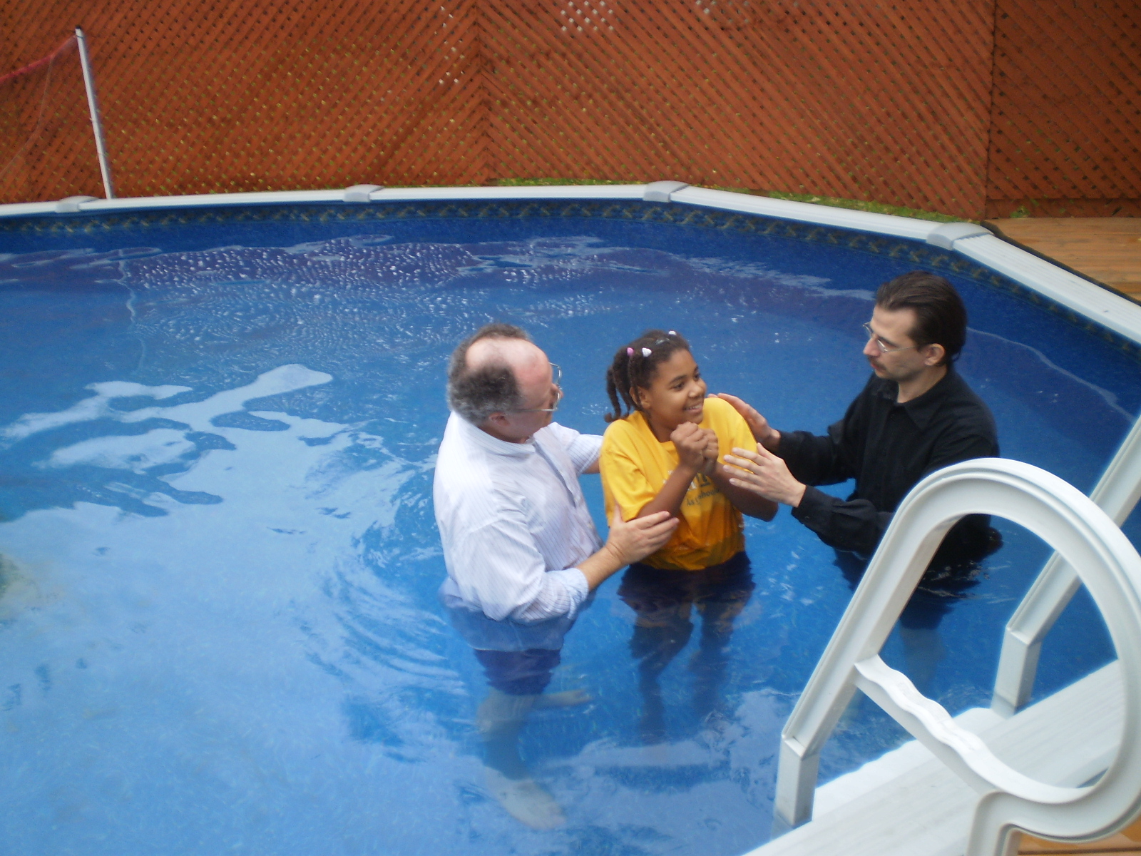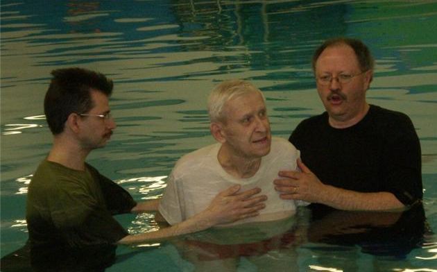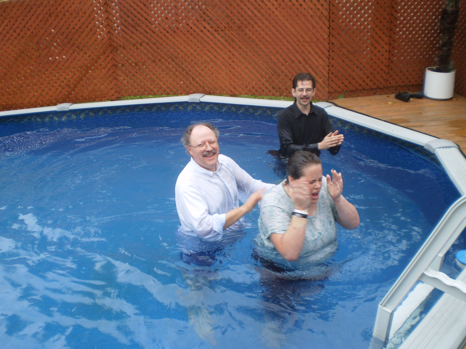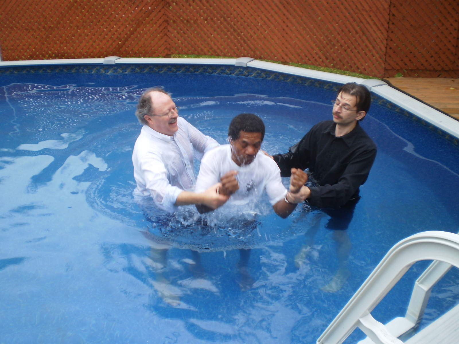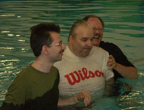 (Above) The LIFE 100.3 FM Booth outside the church doors. (Above) Lead Pastor Rev. Steve Coates with Radio Host Ben Davy (right). (Above) Folks lining up for the food during the fellowship lunch after the message. Lots of people came and participated in the service, and it was a great day! Above- Pastor Steve encourages church goer Ron (left) to give his testimony of the Lord's Greatness in July 2010 Above- Some of the fathers pose for a photo taken on Father's Day June 20th 2010. Each one received a pin and a copy of Foxe's Christian Martyrs. (above) Cecil and Pastor Marg celebrate 55 years of marriage at the church Thursday June 17th 2010 with coffee and cake. Congrats! Above- Pastor Steve encourages a church goer, Glenn, May 2 2010 - - - - - - - - BELOW: From Sunday Apr 25 2010 – The following six baptism photos are by Pastor Tracy Coates at the Main Pool on Main St. North, Newmarket, Ontario. This pool is located only minutes down the road from the church.