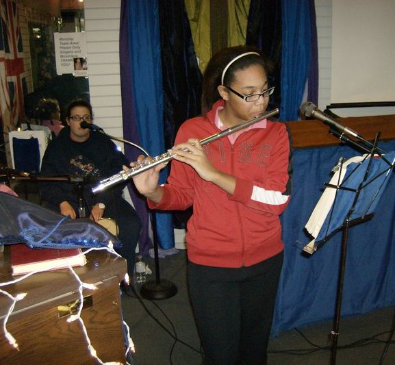 Pastor Marg's 75th Birthday Celebration at Church On The GO Thurs. Feb 3 2011 followed by service. (3 Photos Below) (above) Lead Pastor Rev. Steve Coates with his mother, Pastor Emeritus Rev. Marg Coates, the founder of Church On The GO (Formerly Brown Hill Community Church.) (Above) Pastor Marg with family. (Above) Pastor Marg and Cathy enjoying the service. - - - - - - - - - - - - - - - - - - (Above) Alex brought her flute to the Christmas Worship Jam Sunday night Dec 5th 2010. Here she is seen playing a solo of “O Little Town Of Bethlehem”. She did a great job as did everyone. We had a great night in the Lord, singing Christmas carols, playing instruments, and giving God the glory in Jesus' Name! Thanks to all who participated!