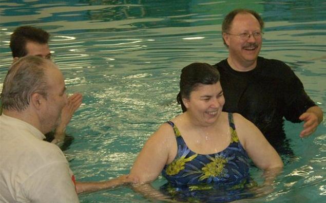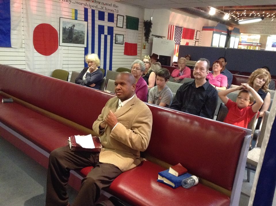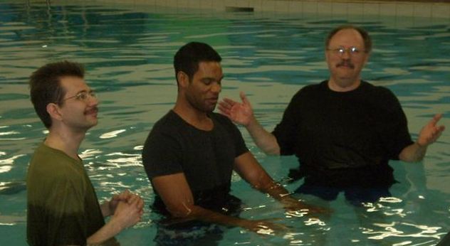 Above- Jessica gets baptized by Pastor Curtis and Pastor Steve. Jessica was given the chance to share how she came to know Jesus by coming to church with her father. In this pool she declared that she will serve the Lord the rest of her life! Way to go Jessica! Above- Keith is baptized – Keith Specializes in guitar, worship, computers, sound and programs at Church On The GO. Keith gave a wonderful testimony about his journey to genuine faith in Jesus. Above- Jason shares his testimony of how he came to Christ, and his pleasant discovery of how wonderful church fellowship is. Above- Aspa, Keith's wife, is also baptized. Keith and Aspa have been faithful helpers at Church On The GO for years, and they decided it was time to re-affirm their faith by getting re-baptized. Above- Arnold, who has known the Lord most of his life, shares a testimony, and now makes the decision to follow the Lord through the waters of baptism. It's never too late to follow the Lord! Above- Rev. Robin Crosby (Front Row, right) was our guest speaker on Sunday Apr 25 2010 at the regular morning service. Many of the people who came that day can be seen in this photo. There was food and prayer afterward. A great day! (Photo by Curtis Alexander)