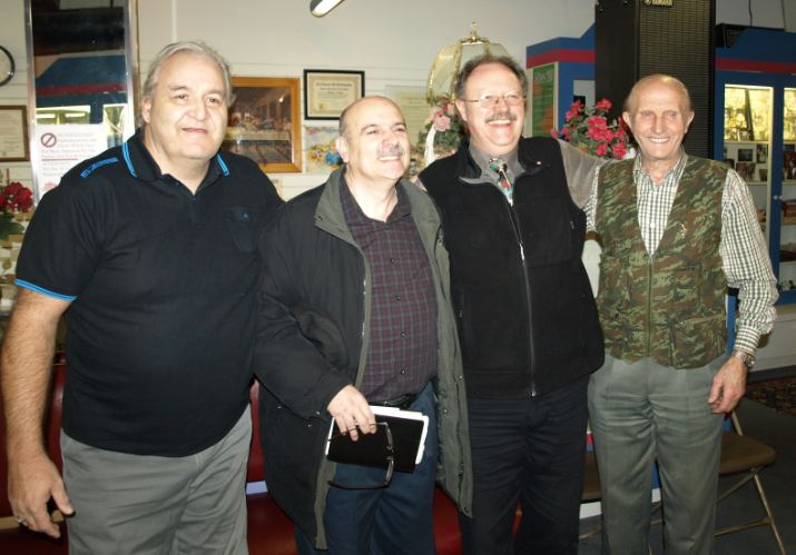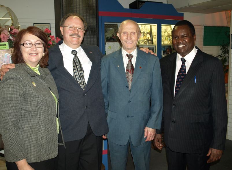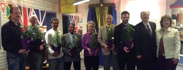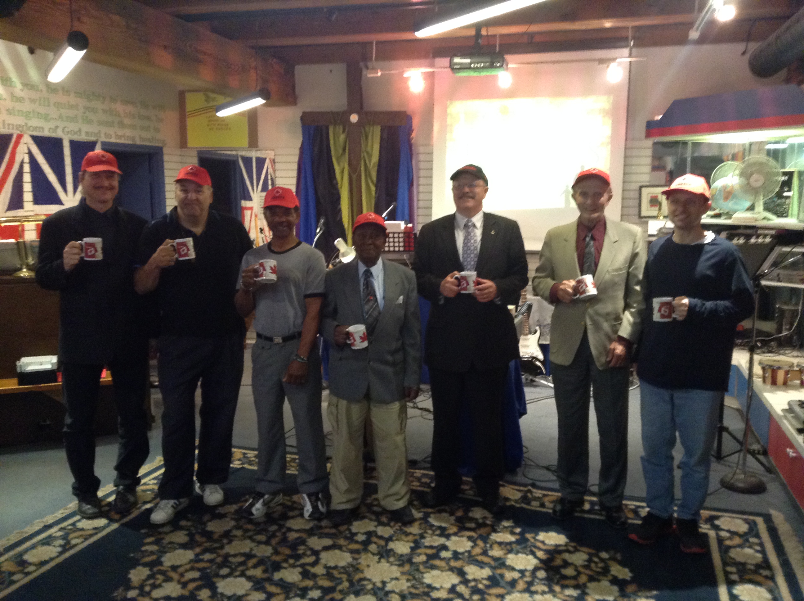 Above- Some of the Spiritual Family at Church On The GO- Photo taken Sun. Feb. 26th, 2012 BACK STANDING ROW, LEFT TO RIGHT: Charlie, Jason P., Ron, Rev. Chris, William, Kevin, Mathew, Pastor Rev. Steve, Pastor Curtis/ MIDDLE SEATED ROW: Janelle, Jason, Julian, Gwen, Serah, Dr. Margo/ FRONT SEATED ROW: Pastor Emeritus Marg, Cecil, Cathy, Pastor Rev. Tracy, Mina, Lunia, Elizabeth, Evelyn/ KNEELING ON FLOOR AT VERY FRONT: Jessica, Alex. [Many church members were away this day and could not be present for this photograph.] - - - - - - Above: Sunday morning Feb. 19, 2012. Left to right- Pastor Tracy, Pastor Steve, Cecil Coates (husband of Pastor Marg Coates who ministered in Kenya with Pastor Ongudi), and Pastor Rev. Richard Ongudi from Kenya. Pastor Ongudi preached at our church that day and also spoke here the day before, on Saturday Feb 18th! Above: Julian reaches an amazing 98 years of age (birthday Feb 16). This photo was taken at Church On The GO's Sunday morning service, Feb 19/12. His family brought a cake to church to celebrate after service! - - - - - - - - - - - - - - - - - - - - - - - - Below: Some of the men at Church On The GO February 2012.